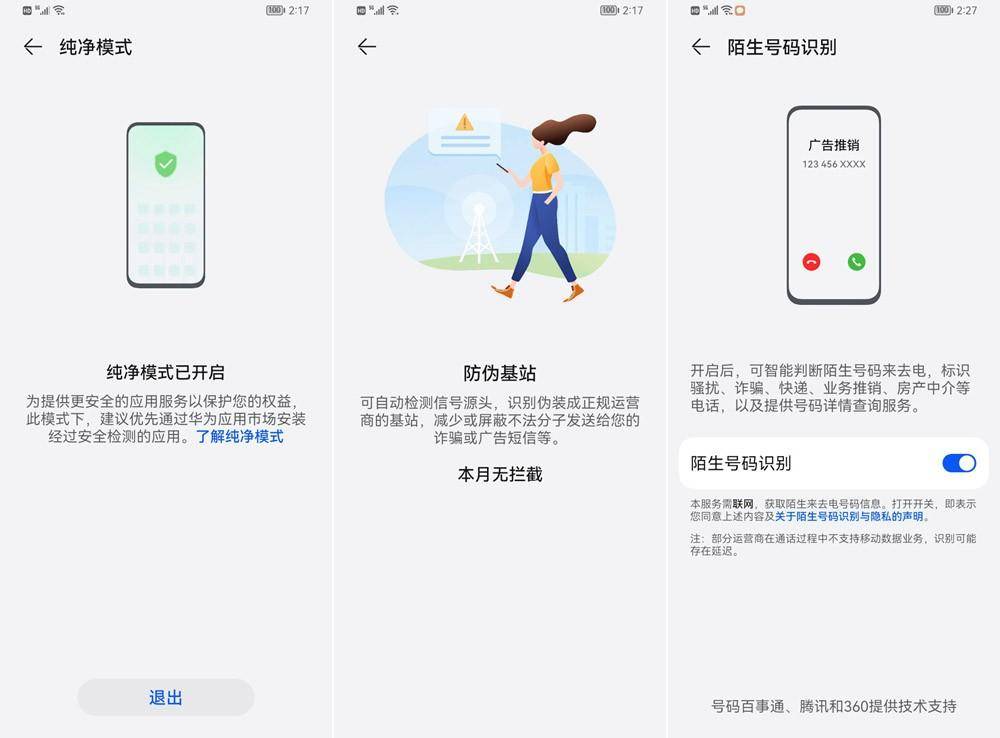 首先值得打CALL的,便是鸿蒙生态为用户所带来的全方位安全防护,无论是诈骗电话、诈骗软件还是伪基站都无从下手,想要窃取你的个人隐私亦或者个人财产都变得不再可能,因为搭载了鸿蒙生态的Hi 畅享60s具备主动防诈骗能力,启用纯净模式后,可以自动拦截诈骗电话、信息和软件,从而为用户提供安全无忧的用机环境,相信这一特色功能对于家里有老年用户的情况来说,确实是非常贴心实用的保护举措。