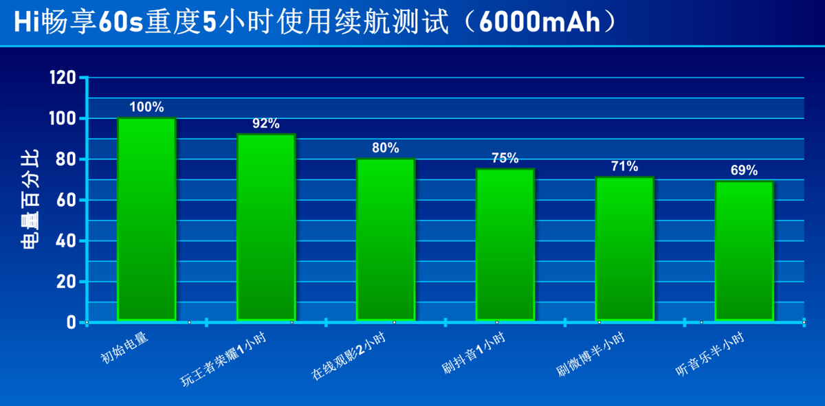 首先值得肯定的是,Hi畅享60s 5G这款手机采用了高达6000mAh的超大容量电池,完全超越目前市面上旗舰手机也顶多4000-5000mAh的电池容量,毕竟电池容量决定了手机的续航能力。而在满电状态下,经过笔者模拟5个小时的重度测试,最终一番折腾下来,Hi畅享60s 5G手机的剩余电量还保持高达69%这么多。由此可见,正常使用的话基本可以两三天才充一次电,彻底告别过去需要一天一充,甚至一天两充的用电焦虑。