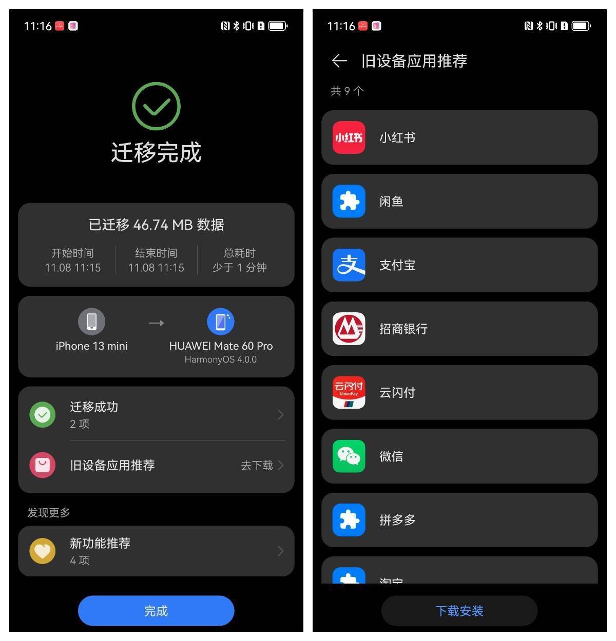 接下来只要等待片刻就能将数据完美迁移到华为Mate60 Pro上了,需要指出的是,在迁移完成页面,还可以点击「旧设备应用推荐」,点击进入就能看到旧设备上安装的应用,可以直接一键安装,省去了在华为应用市场重新搜索安装的麻烦。