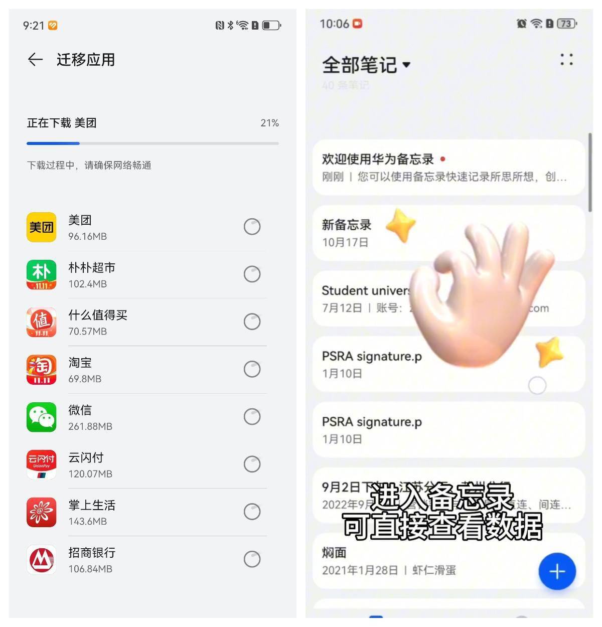 显示迁移完成后就不需要任何操作了,数据会自动导入相应的App,就比如进入华为Mate60 Pro的备忘录会看到原本在iPhone上保存的所有备忘录,实实在在省去了大量的迁移工作,要是放在过去,还需要一个个复制、转发、再复制、粘贴。值得一提的是,通过换机无忧的OTG模式数据迁移成功后,也支持旧设备应用推荐下载。