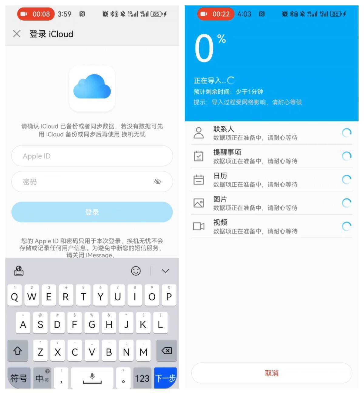 此外,换机无忧App还有一个iCloud模式,顾名思义就是通过iCloud下载数据再导入的方式进行迁移,核心就是直接在华为Mate60 Pro上选择iCloud模式登陆你的苹果账户,再勾选日历、联系人、备忘录、图片、视频以及提醒事项等数据进行导入。
