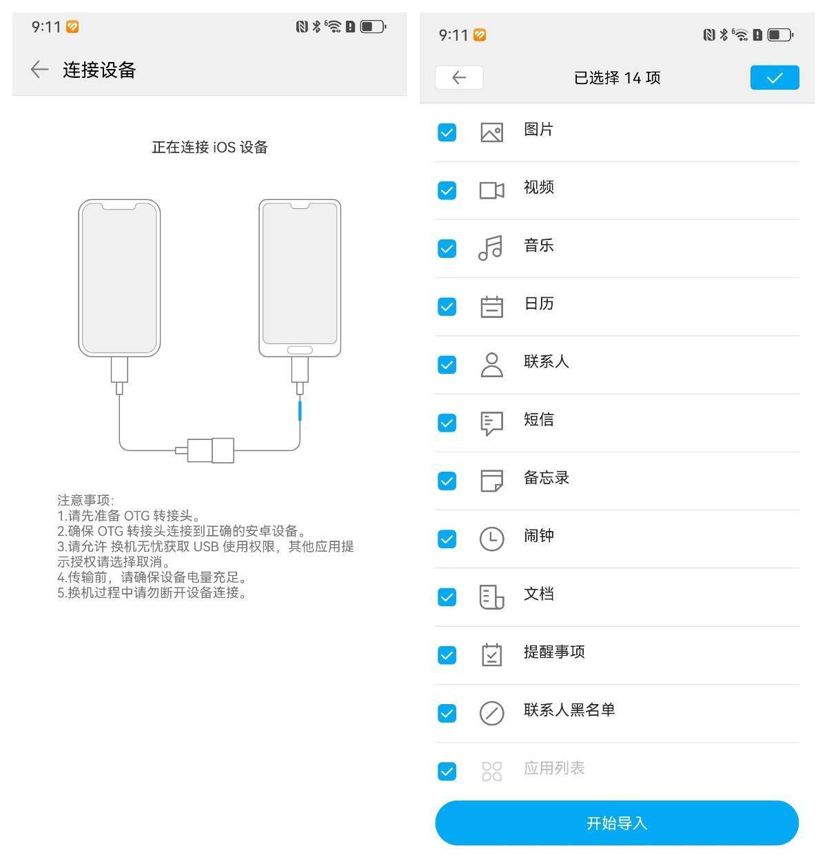这就不得不提起另一款经过华为应用市场安全认证的「换机无忧」App,有OTG模式与iCloud模式两种迁移方式,iCloud模式暂且按下不表,而通过OTG模式我们可以实现多达14种手机本地数据的自动迁移,包括: