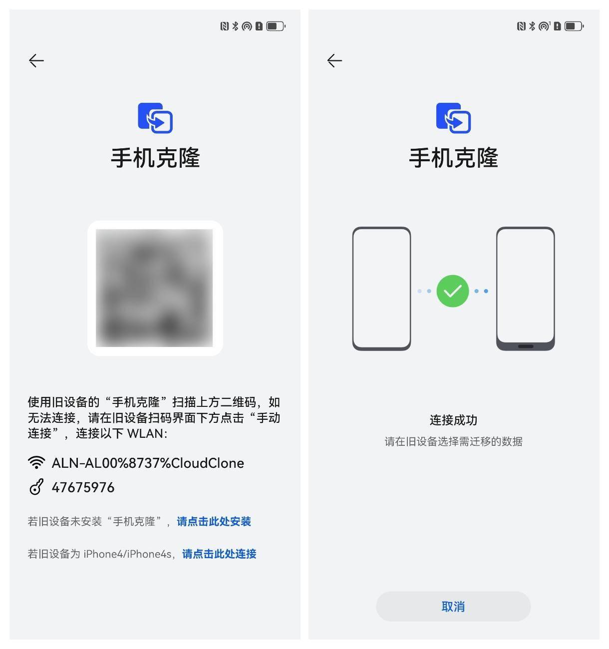 操作也很简单,在华为Mate60 Pro上进入华为手机克隆App选择「这是新手机」,授予权限后会自动生成一个二维码(实质是无线热点)。