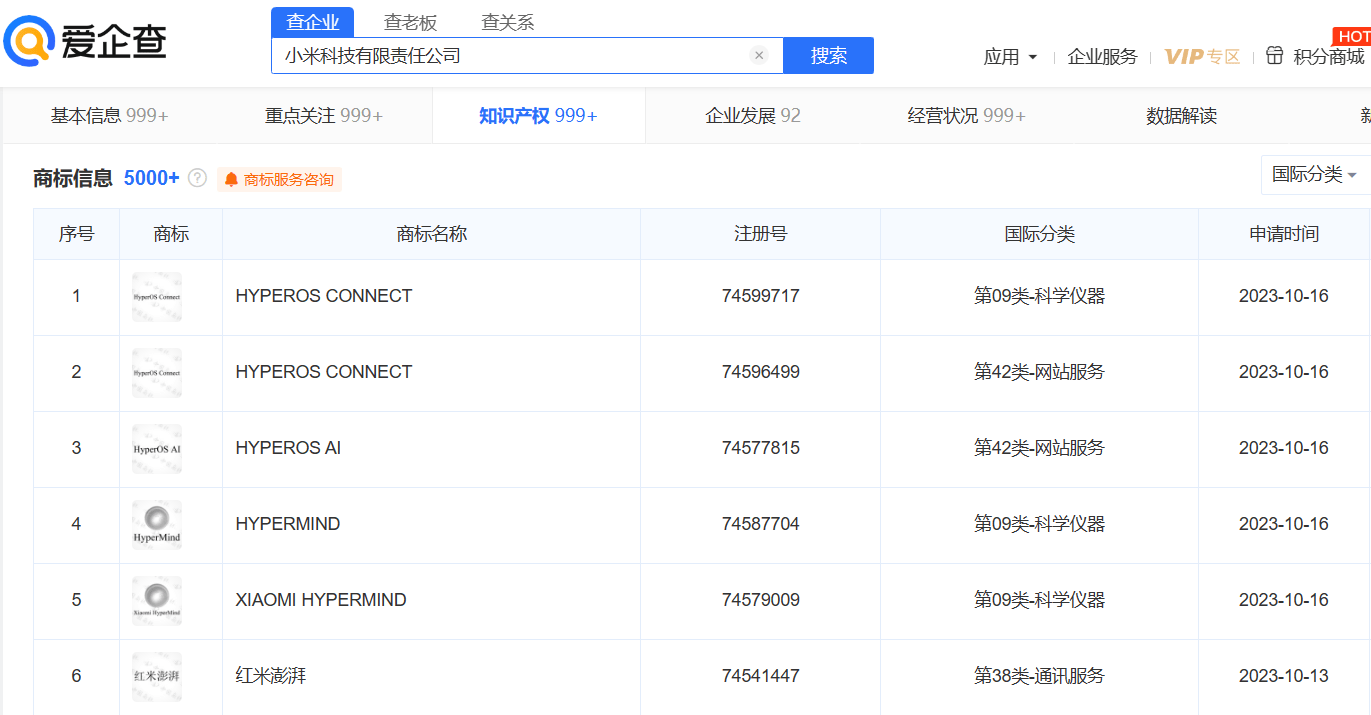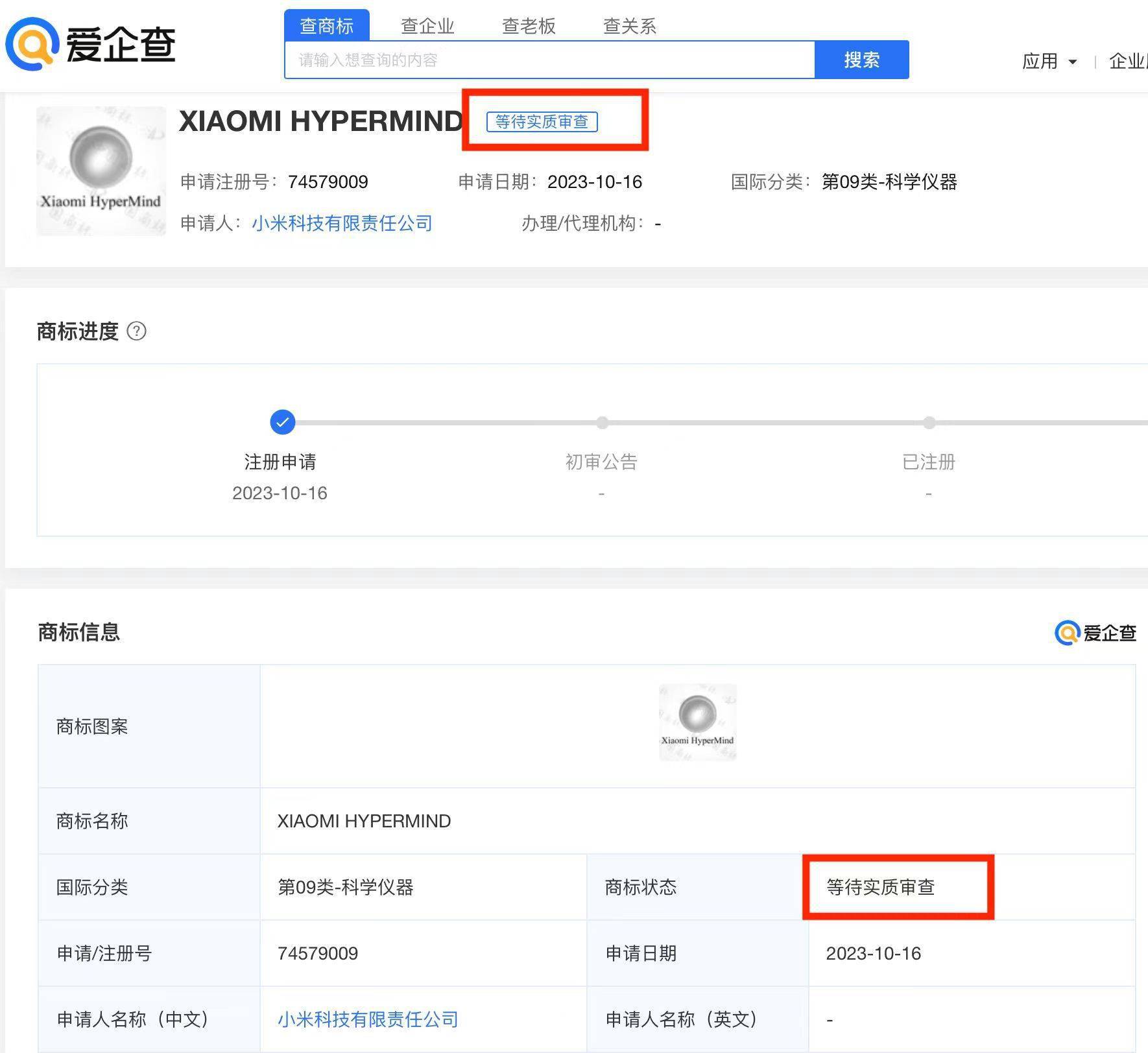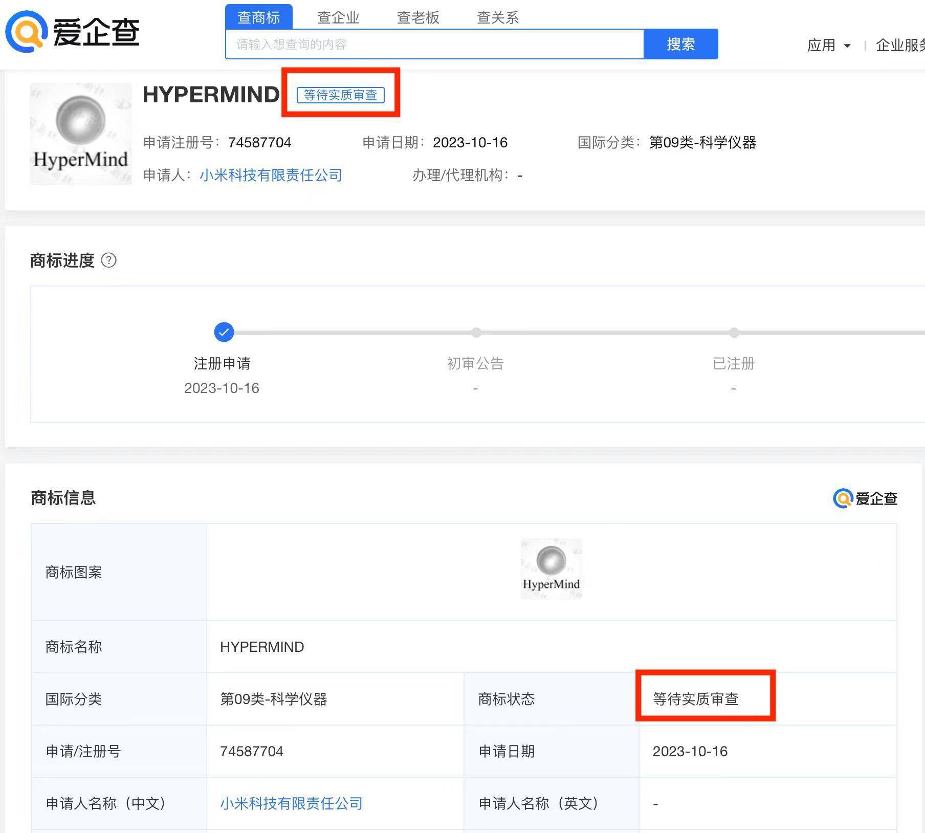 爱企查显示,近日,小米科技有限责任公司申请注册“HYPERMIND”和“XIAOMI HYPERMIND”商标,国际分类为科学仪器,目前商标状态均为等待实质审查。