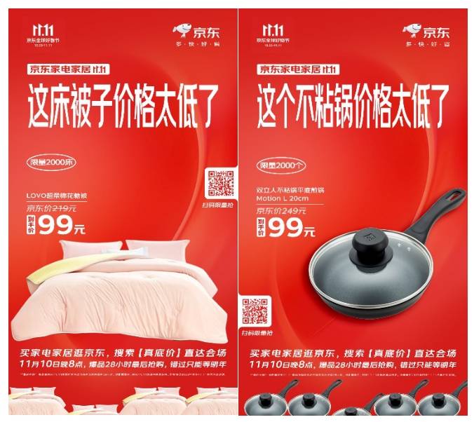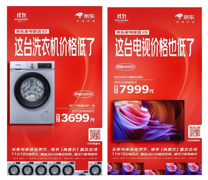 在政策的推动下,家电家居市场的低价竞争显得尤其激烈。京东11.11期间,京东不但推出家电家居百万好物9折优惠,而且直播间的采销们更是实时对标头部主播,甚至还现场调价保证价格更低,格力空调、酷开100英寸电视、戴森无绳吸尘器、海尔烘干机等爆款商品甚至刚刚挂出链接,就被抢购一空。