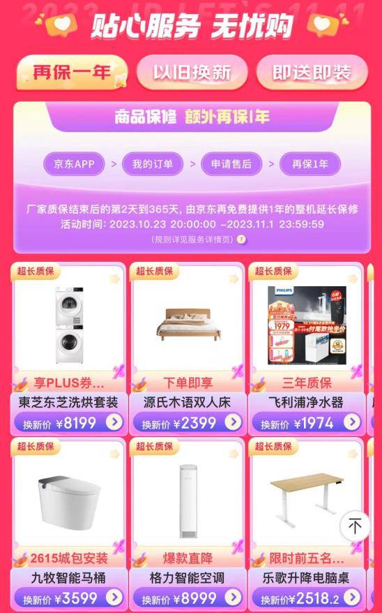 对于广大消费者而言,仅有低价还不够。低价只是消费者最基础的诉求,也是零售企业竞争力的根基。对于企业来说,如何在保证低价的同时,提供超出预期的消费体验,是一个具有挑战性的问题。京东的做法,是在保持优势服务项目的基础上,不断“加码”,扩大领先优势,如提供200多项针对用户痛点的基础服务,包括80余项行业首创、行业独有服务,为消费者的购物体验保驾护航。据了解,京东11.11期间,不仅超90%的家电自营商品及超过50个品类的家居商品参与以旧换新服务,还提供以旧换新补贴翻倍,低至0元换的“福利”,同时在洗衣机、冰箱、电视等家电品类的即送即装服务之外,针对沙发、床、床垫、柜类等家居品类提供送装一体服务,省时省心又省钱。消费者在京东进入商品详情页后,通过以旧换新入口进行下单,然后只需要选择旧品信息,就可以享受补贴立减,以及由京东提供的1次上门完成收旧、送货、安装、验机、调试的一体化服务,且不管消费者在什么渠道购买的旧家电家居商品,不限品牌、不限渠道、不限年限、不限品相,均可在京东换新。同时,京东家电家居还坚持免费上门、免费拆旧、免费搬运的“三免”服务,为消费者提供更高标准的服务体验。数据显示,京东11.11期间,京东家电家居以旧换新服务,通过免费上门拆卸清运以及高力度的购新补贴,累计为用户节省3亿元。
