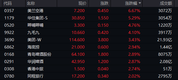 旅游、酒店、餐饮等消费板块集体走高,截至收盘,华住集团、新世界发展涨超5%,呷哺呷哺、九毛九涨超4%,海底捞涨约3%。