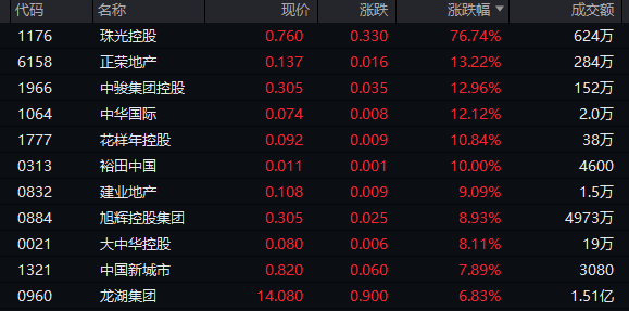 地产板块今日走势活跃,截至收盘,珠光控股大涨近80%,正荣地产、花样年控股等涨超10%,建业地产、旭辉控股集团涨约9%,龙湖集团涨近7%,恒隆地产涨超5%。