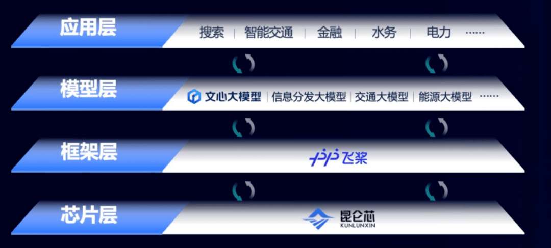在智能时代的四层IT架构中,芯片层,百度有昆仑等面向AI计算的芯片技术布局;框架层,有飞桨深度学习这样的平台;在模型层,则有文心大模型家族(包括文心大模型4.0在内的自然语言处理方向的基础大模型,视觉、跨模态、生物计算等其他方面的大模型,以及众多的行业大模型)来克服机器训练的难题;在应用层,则涌现出智能搜索、智能交通等原生AI应用,互相协同的四层技术栈构成AI时代的通用计算架构。