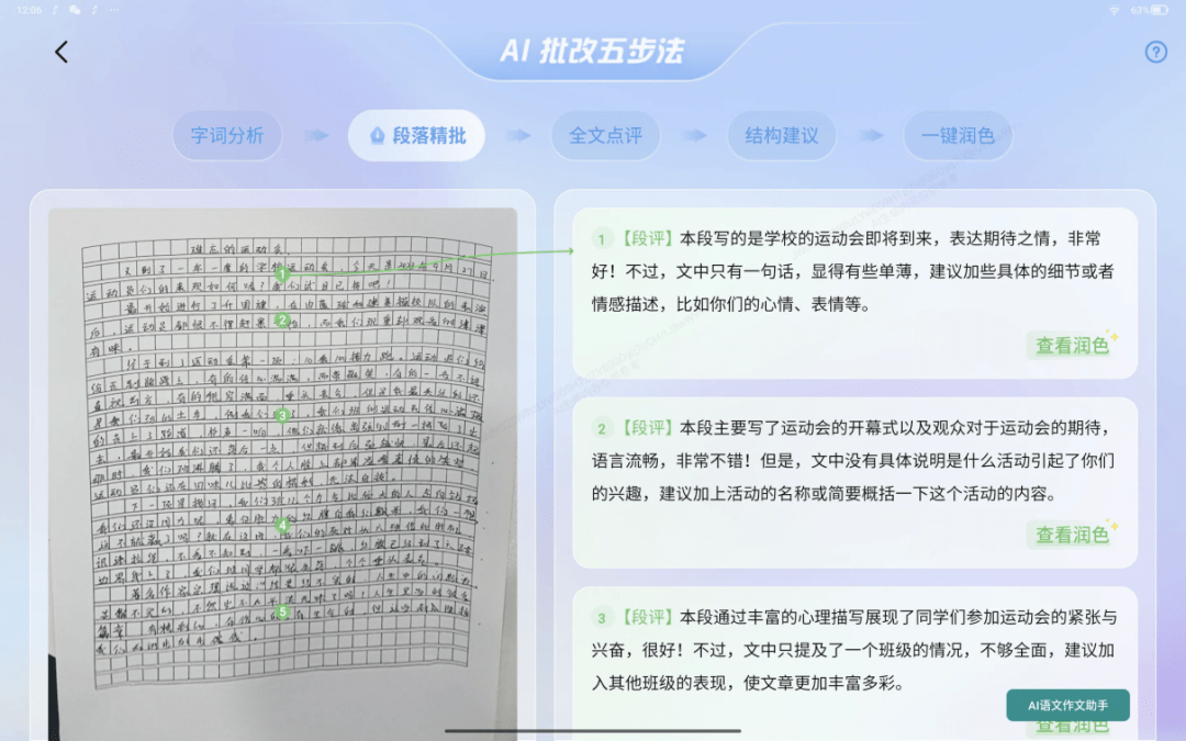 以中文作文批改功能为例,学而思让大模型专项学习了教研老师提炼的“字、词、句、段、篇”五步优化法,可以实现对语文作文的“一键润色”。