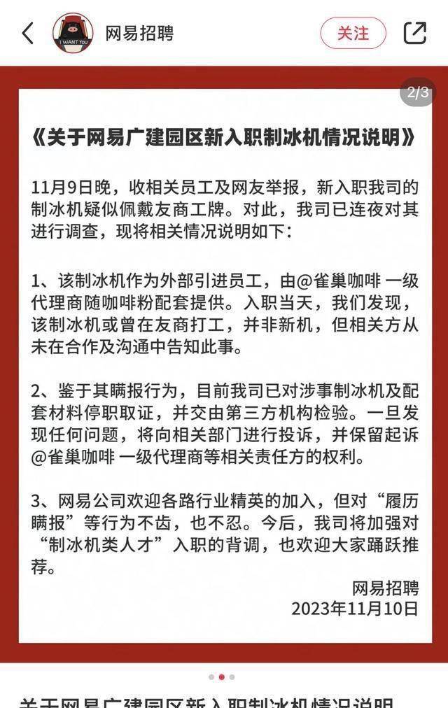 凤凰网科技讯 11月10日,近日网易办公区出现了贴有腾讯标签的制冰机的消息在网络热议。对此,网易招聘官方对此事做出了诙谐的回应,网易方面表示,经调查发现,该制冰机作为外部引进员工,由雀巢咖啡一级代理商随咖啡粉配套提供。且在“入职”当天,该制冰机或曾在“友商打工”,并非新机。目前,网易将涉事机器及配套材料交由第三方机构检验,如有问题,将向供应方等相关责任方起诉。
