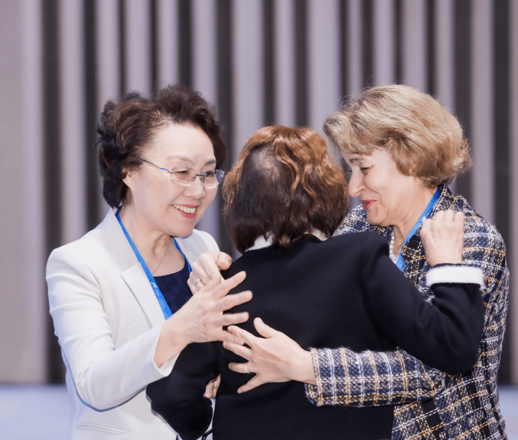 王红阳院士(左)与联合国教科文组织前总干事伊琳娜·博科娃(右)和匡廷云院士拥抱
