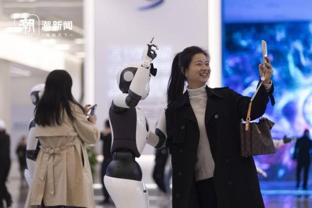 观众们拿出手机合影,人形机器人很自然地高举起手,比出“剪刀手”。