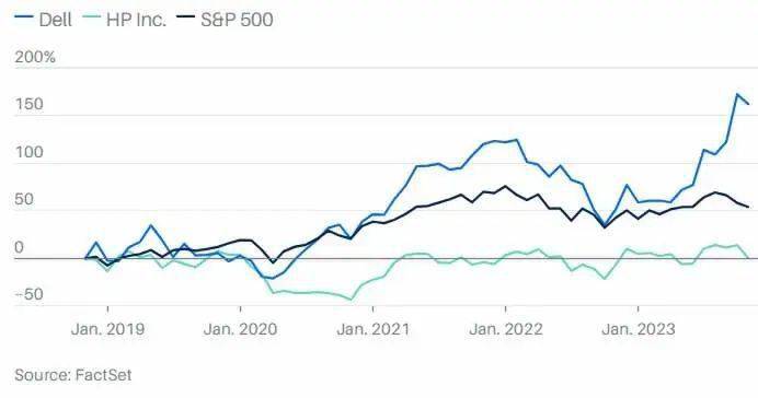 过去五年,戴尔股票跑输竞争对手惠普和标普500。从市盈率来看,戴尔和惠普的股票都很便宜。