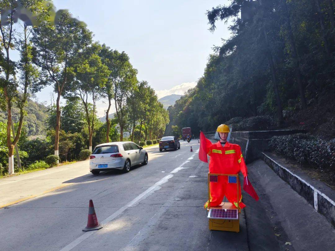 这个警示机器人全身亮桔色,通过太阳能板提供动力,以每分钟25-30次固定频率挥舞红旗,警示效果良好。同时,根据《公路养护安全作业规程》临时养护作业要求,该设备还能起到上游过渡区交通引导作用,减轻劳动力。班站职工使用后都感到上路作业好像多了个专门负责指挥的“队友”,更安心了。