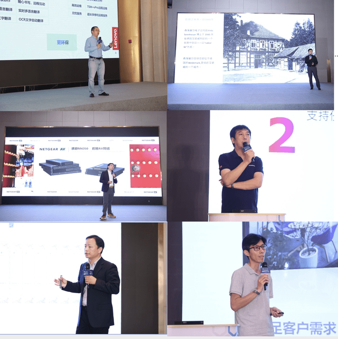 Q-SYS生态系统合作伙伴及授权代理商现场分享最新智能会议技术,发言嘉宾包括联想智能协作资深产品营销总监吴敏 (左上)森海塞尔商务通讯北区销售经理赵旭(右上)Netgear亚太区ProAV设计顾问团队高级经理郭浩航 (左中)巴可中国会议体验部门产品经理赵猛(右中)佳联公司技术总监王冷霜 (左下) 聚沣公司技术经理陈庆权(右下)。