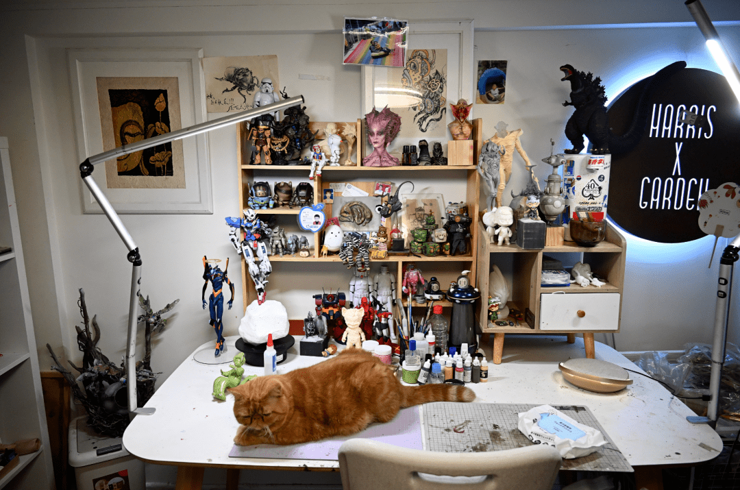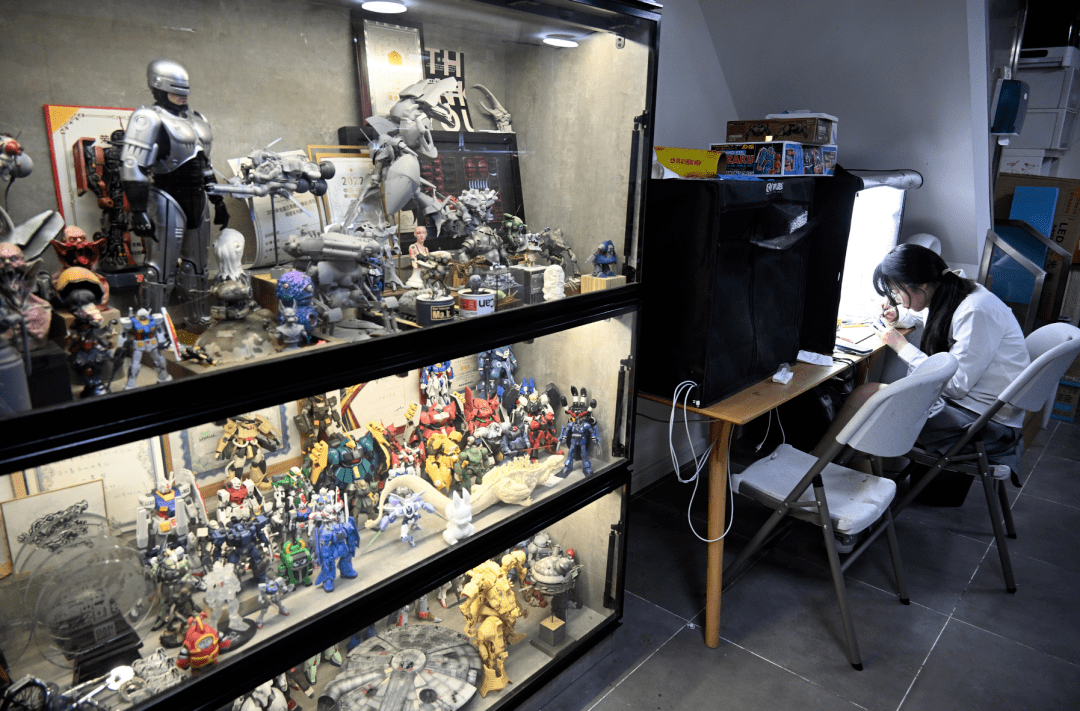 一把刻刀,一瓶颜料,一支涂装枪,坐在桌子前的大黄将目光锁定在手办的涂装改造上,每一次细微的调整都决定着模型的完美与否。旁边的加菲猫安静地趴在桌上。