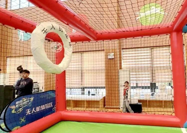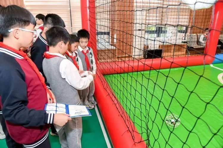 模型嘉年华环节,无人机足球射门、模拟赛车驾驶、遥控船对抗、建筑模型制作等体验活动吸引学生们的围观和参与。绿地小学带来无人机足球项目,学生们操控着模拟飞行器,4个如球一样的无人机在“迷你足球场”进行“足球”比赛,两边悬挂着的“游泳圈”作为双方“球门”,无人机两两配合穿梭过门即可得分。“这个项目需要分工协作,有防守和进攻,可培养学生的团队协作能力,同时也培养学生持之以恒、克服困难的能力。”绿地小学无人机社团负责人朱文豪表示。