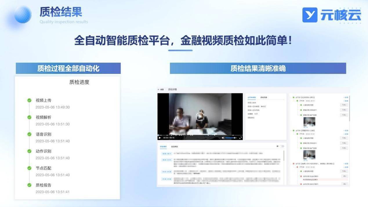 在AI技术和智能视频分析技术的支持下,智能质检可以结合最新质检要求和标准建立业务模型并设立统一规范的质检规则,全面覆盖质检点,对所有视频资料进行100%全量质检,有效规避人为判断失误、漏检等情况的发生,经测试,元核云智能质检准确率超过98%,高精准全方位地为金融业务合规发展保驾护航。