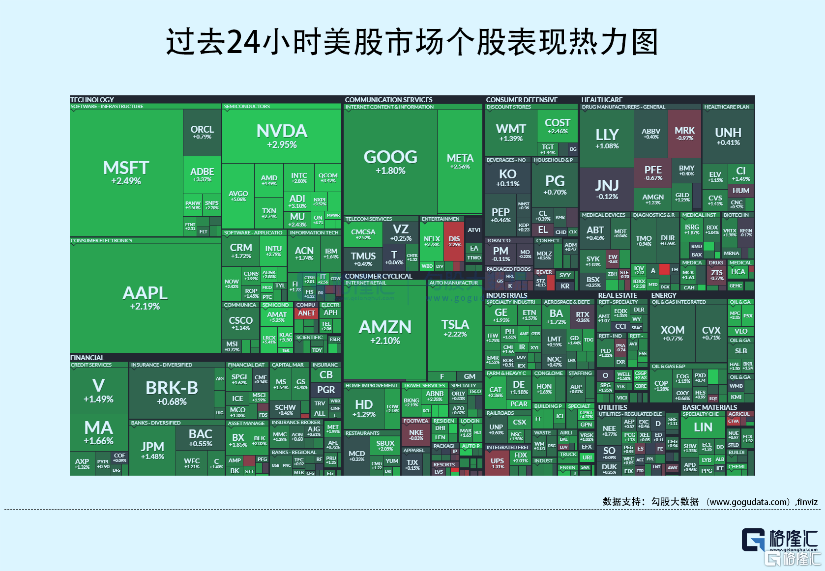 行业板块方面,标普11大板块悉数收涨:半导体、科技、通讯分别收涨4.03%、2.61%和1.59%,工业、原料、金融、房地产、能源均收涨1.1%以上1.59%以内,日常消费、医疗和公用事业分别收涨0.7%、0.6%和0.53%。