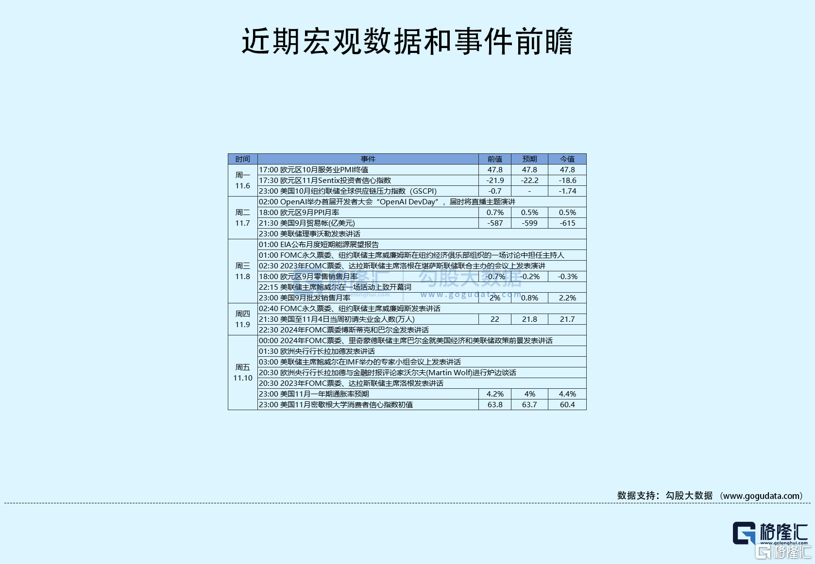 中概股涨跌互现,KWEB涨0.19%,11月14日至17日将在美国旧金山举行中美元首会晤。台积电涨 6.35%,台积电10月销售额为2432亿元台币,创月度营收历史新高,同比增长16%,环比增长34.8%。阿里涨 0.02%,拼多多涨 0.66%,京东涨 0.04%,网易涨 0.81%,百济神州涨 5.04%,理想跌 1.83%,小鹏跌 3.96%,蔚来跌 3.08%,新东方涨 0.37%,华住涨 0.58%,瑞幸咖啡涨 0.66%,名创优品涨 0.12%,亚朵涨 2.14%。