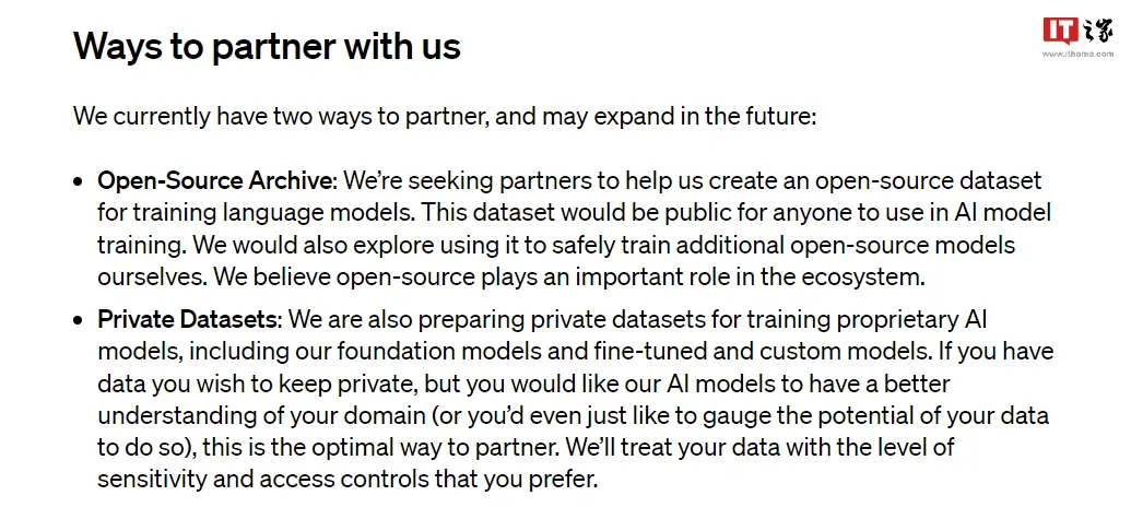 OpenAI 希望创建两种类型的数据集:一个可供任何人在 AI 模型训练中使用的公开开源数据集,以及一组用于训练专有 AI 模型的私有数据集。