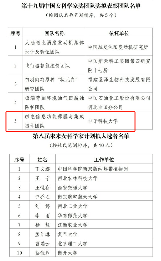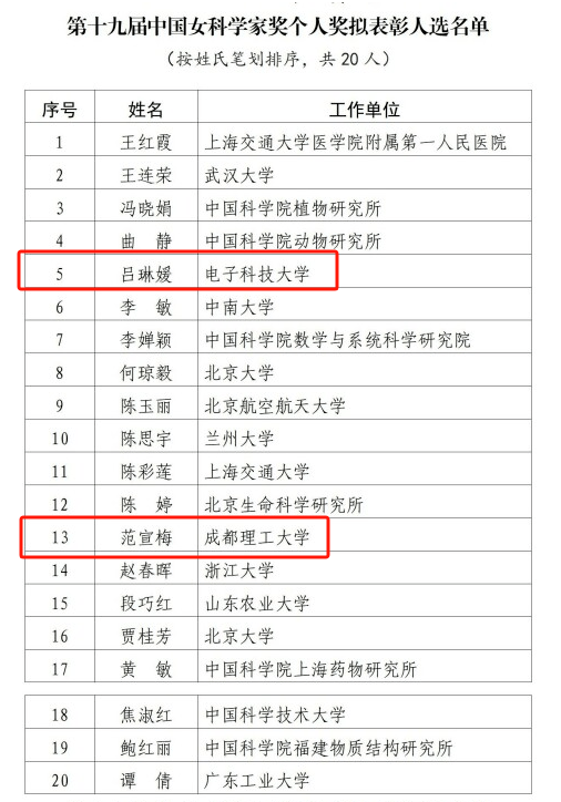 根据名单,来自电子科技大学的吕琳媛和成都理工大学的范宣梅入选第十九届中国女科学家奖;电子科技大学磁电信息功能薄膜与集成器件团队入选十九届中国女科学家奖团队奖。
