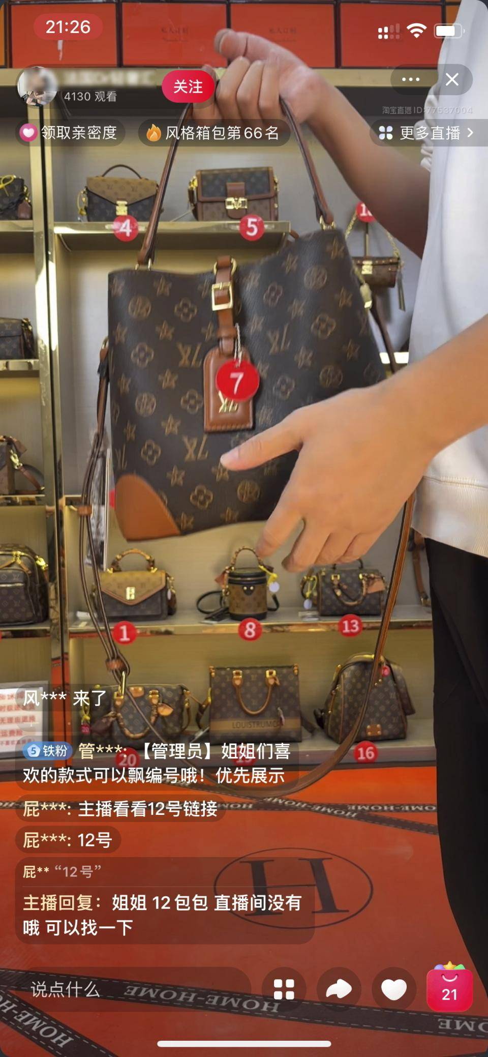 这种直播带货方式在某些销售“名牌包”“名牌衣服”的直播间里显得更加离谱。在淘宝直播平台,有主播声称一万多元拿下的名牌包,现在优惠九千九,只需一百多元。主播刻意回避了“LV”的品牌名称,但直播间的售卖的产品与LV包款式雷同。