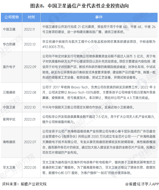 近年来,卫星通信产业代表性企业的投资动向主要包括募集资金建设卫星通信前沿项目、签订协议合作开发项目等。卫星通信产业代表性企业最新投资动向如下: