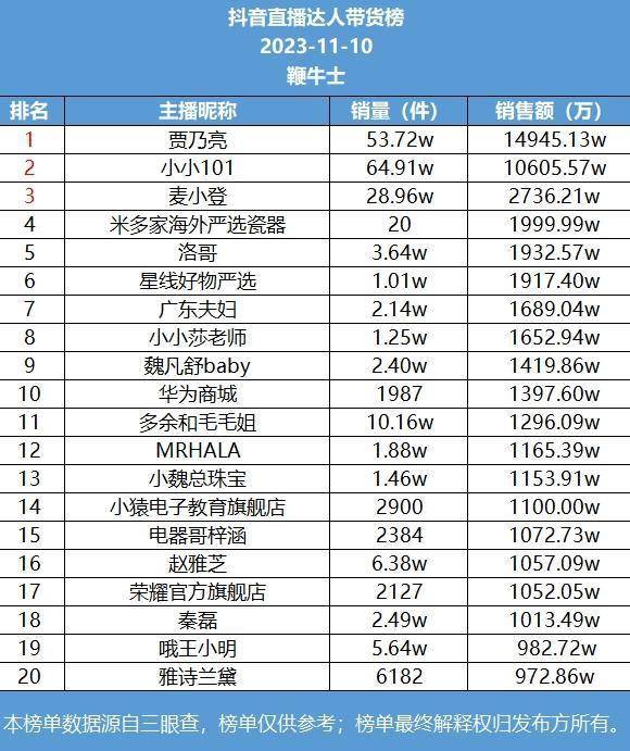 11月10日,抖音直播达人带货榜一是贾乃亮,销售额14945.13万;榜二小小101,销售额10605.57万;榜三麦小登,销售额2736.21万。