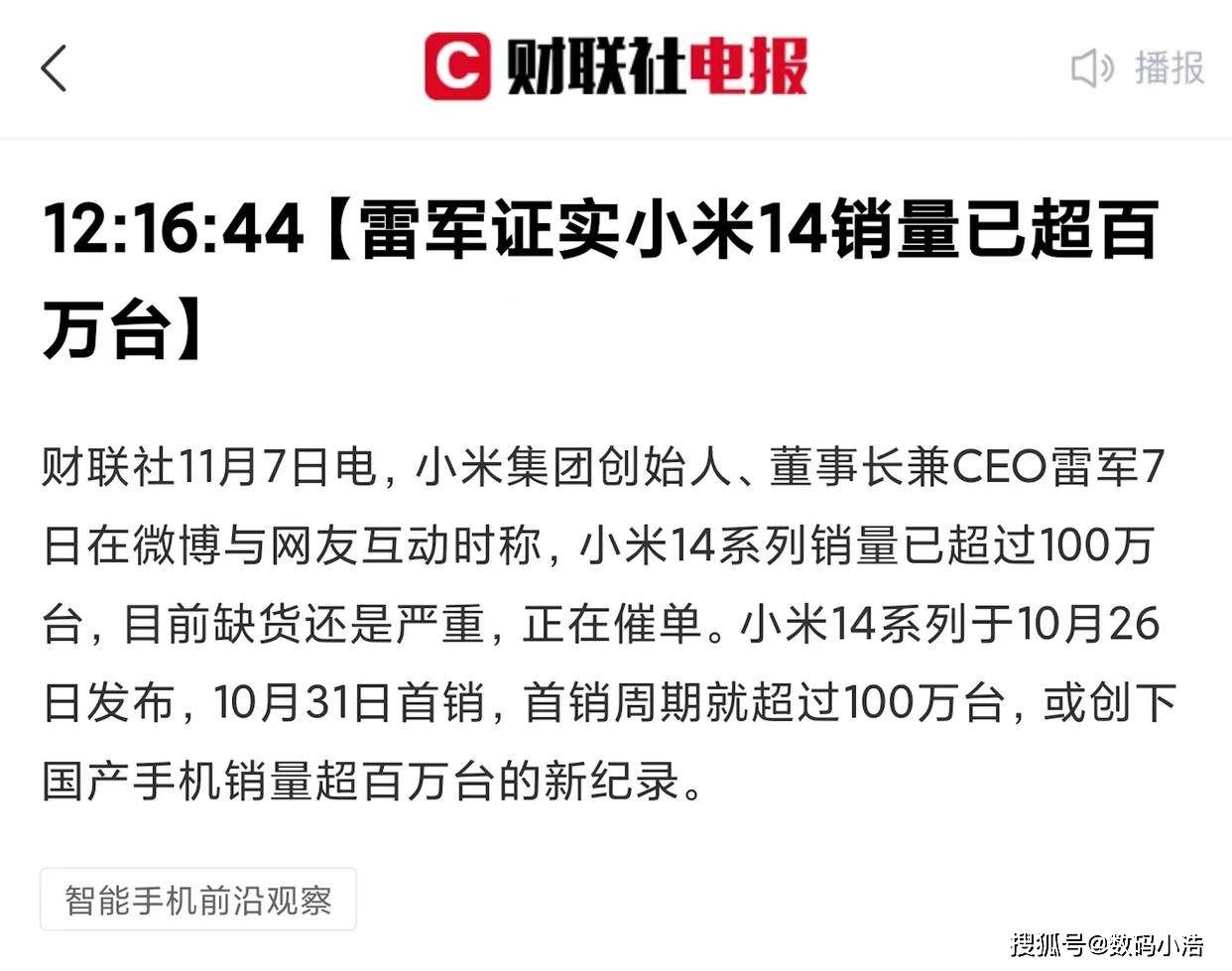 但小米14系列发布之后,取得的成绩确实非常惊艳,销量已经全面压制iPhone15 Pro,首销成绩超过iPhone,并且打破了电商平台近一年单品新机首销记录,雷军在回复网友时候也说了,小米14破百万销量(这里我个人理解应该是小米14系列的两款机型),这也是创下国产高端旗舰机破百万台的最快纪录。