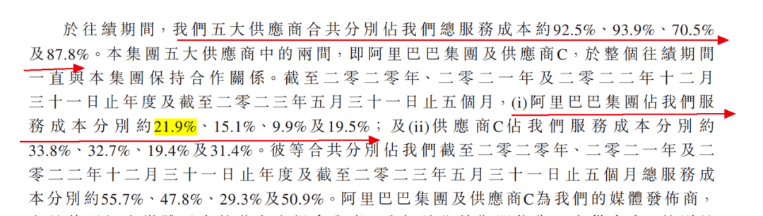 招股书显示,2020年-2023年5月,公司五大供应商合共占总服务成本约92.5%、93.9%、70.5%、87.8%。其中,阿里占服务成本约21.9%、15.1%、9.9%、19.5%。