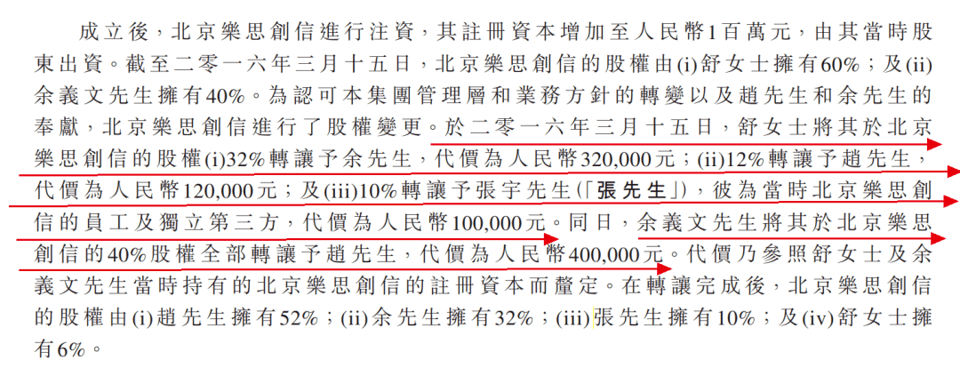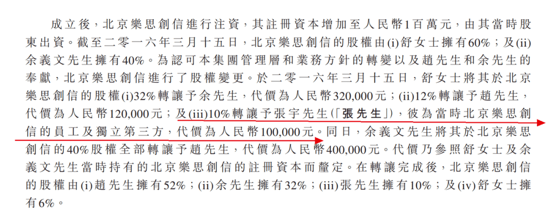 「创业最前线」注意到,2016年3月,余灿良妻子舒清将其于北京乐思创信的10%股权转让予员工张宇,代价为10万元。在公司期间,张宇曾担任销售及营销副总裁。