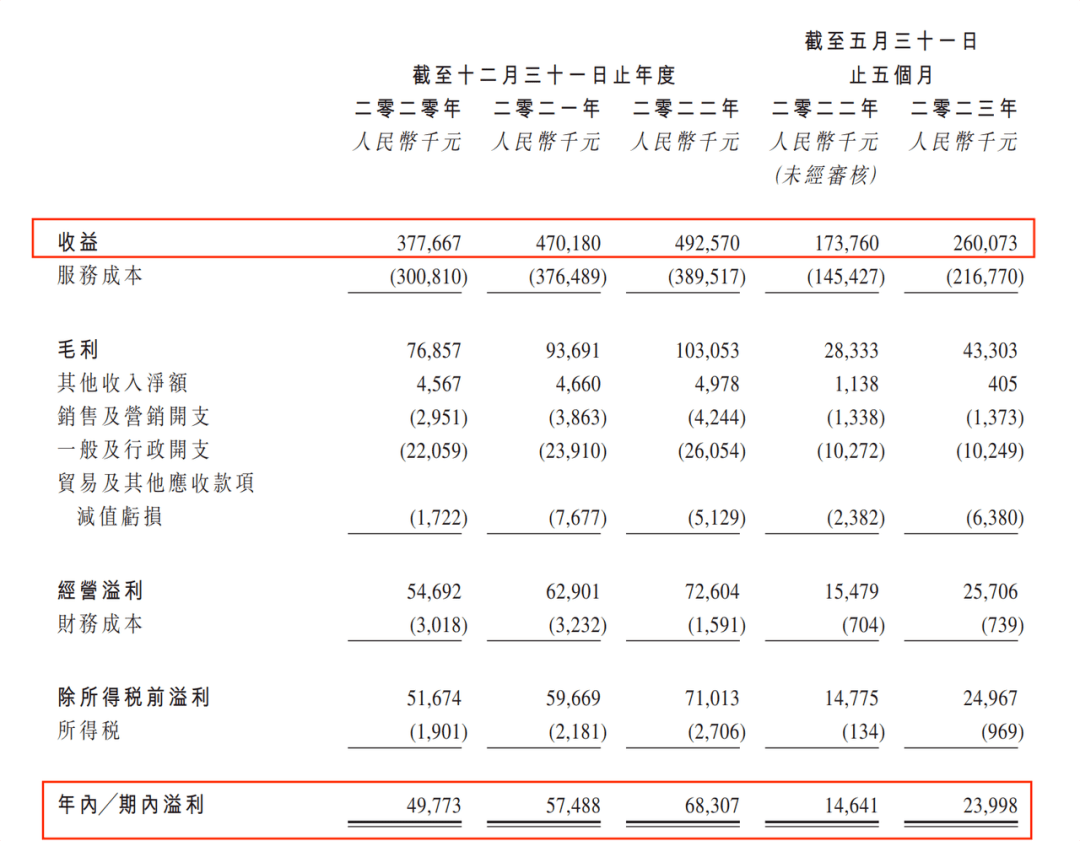 招股书显示,2020年-2023年5月,其收入分别为3.78亿元、4.70亿元、4.93亿元、2.60亿元,溢利4977.3万元、5748.8万元、6830.7万元、2399.8万元。