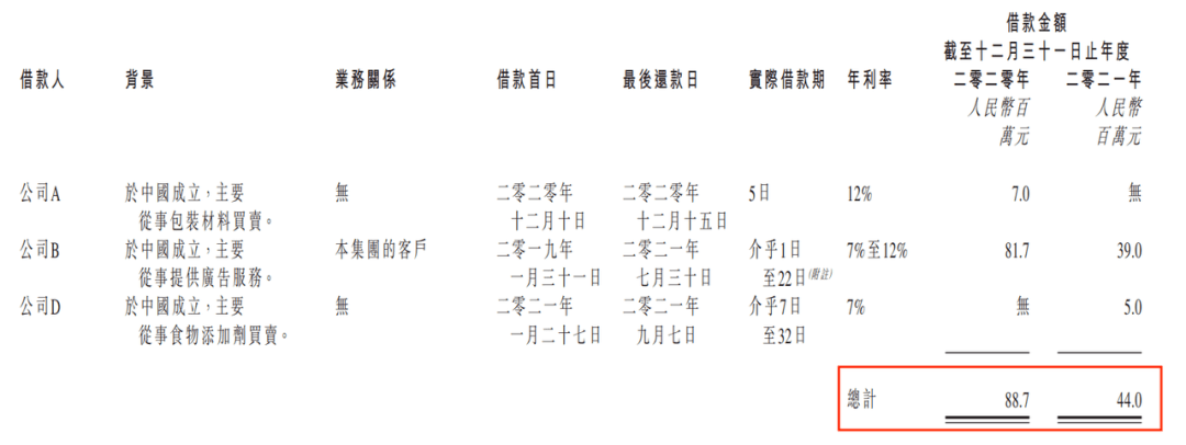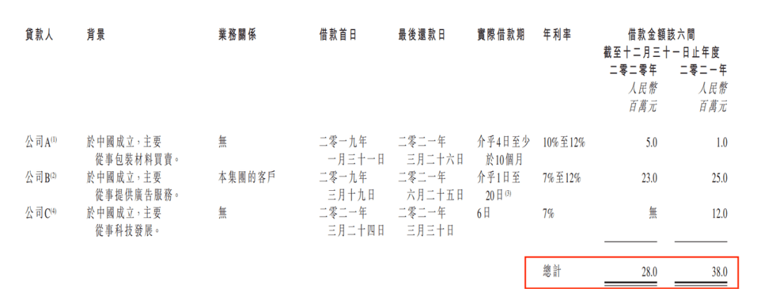 招股书显示,2020年、2021年,公司向3名为独立第三方(公司A、B、C)的非金融机构取得借款2800万元、3800万元,期限介乎1日至10个月,利率在7%-12%之间。