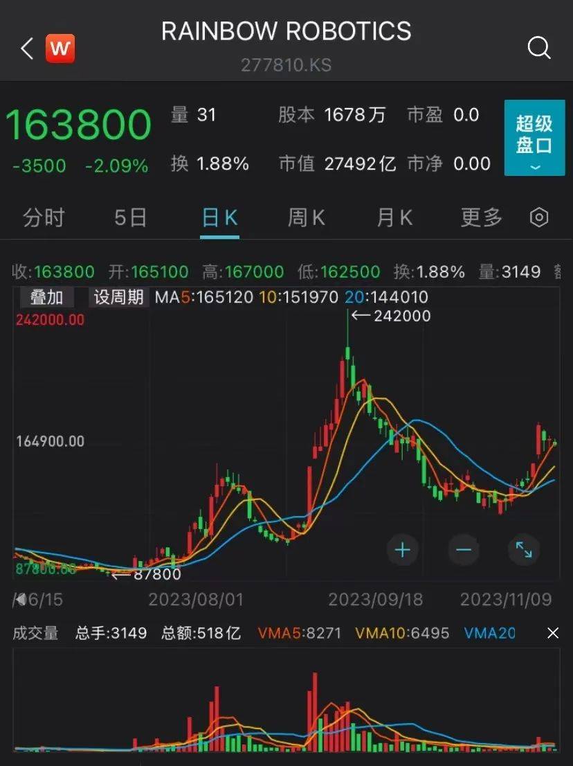 三星电子公司资助的彩虹机器人(Rainbow Robotics)股价今年以来已累计飙涨了约3.7倍。今年3月,三星将其在彩虹机器人的持股比例提高至15%。