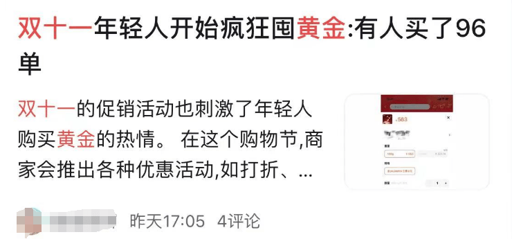 黄金消费大热,双11进一步爆发,表面上是一个消费新趋势,实际上则是消费风向转变。可以说,年轻人消费黄金越是“上头”,越能体现他们的务实理性。