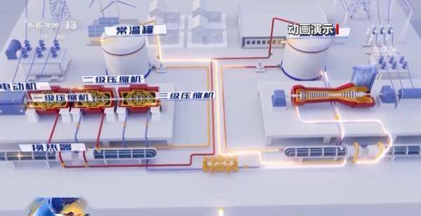 在江苏常州的金坛盐穴压缩空气国家试验示范电站,这个电站可以把电能储存在废弃的地下盐穴里。它在夜间用电负荷低的时候,用电带动空气压缩机充电,过程好比给盐穴这个“气球”打气,将1个标准大气压的空气压缩为140个标准大气压的高压空气。白天需要时,一键启动释放压缩空气,产生巨大的动能带动发电机发电。