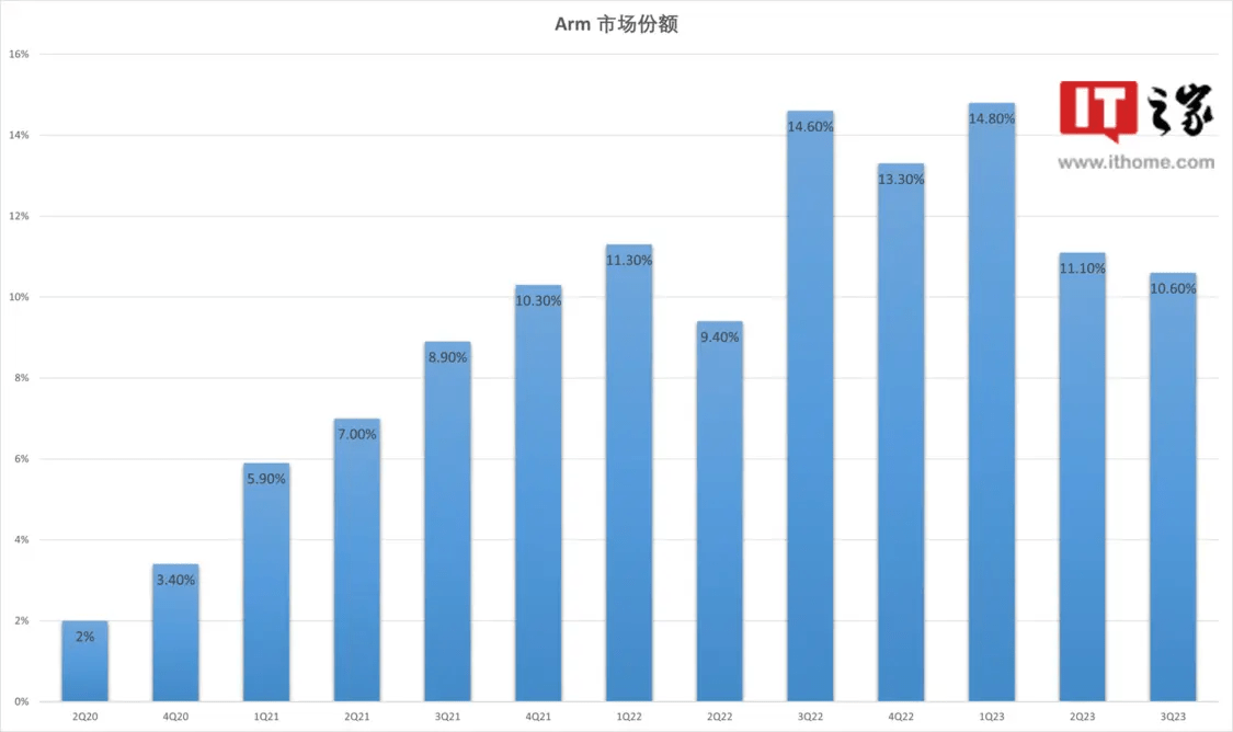 该机构表示,Arm SoC 出货量 2023 年第 3 季度出货量占比为 10.6%,相比较去年同期的 14.6%,下降了 4 个百分点,不过相比较 2020 年的 2-3%,依然是不错的成绩。