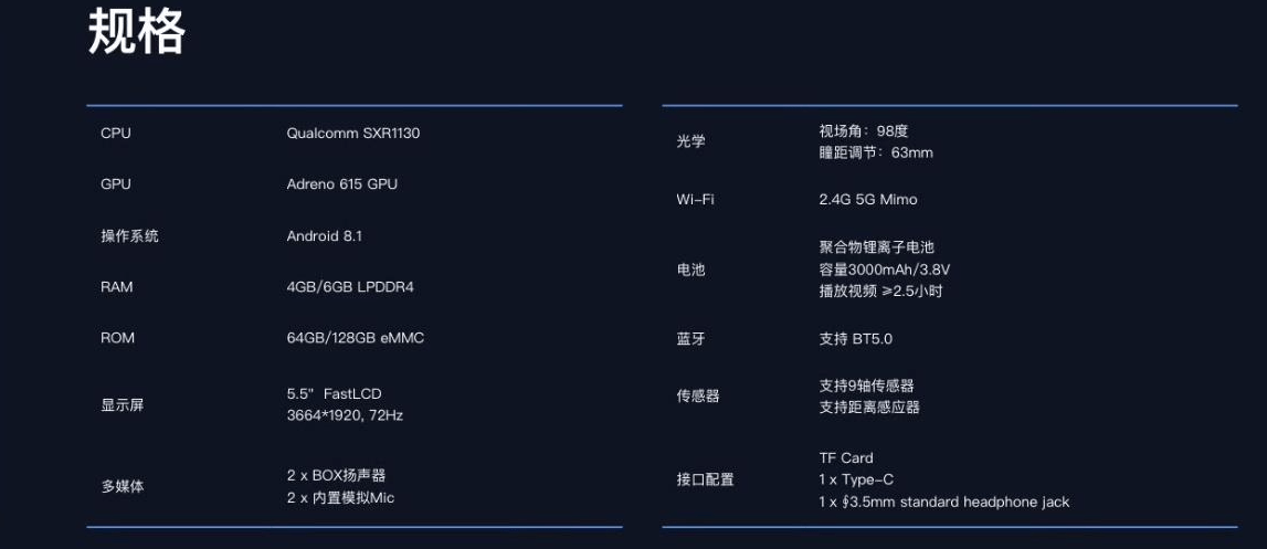 其他配置方面,这款山寨头显配备了4GB/6GB内存和64GB/128GB闪存,用的屏幕为5.5英寸3664*1920 LCD材质,刷新率为72Hz。