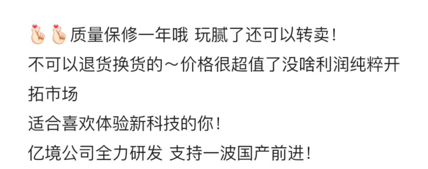 大多数情况下,为了规避风险,山寨厂商往往会选择低调做人,不会让用户知晓自己的真面目。毕竟,山寨产品始终是灰色地带的产物。但有意思的是,这位宣传山寨Vision Pro的商家,表示这款产品是由亿境公司打造的。