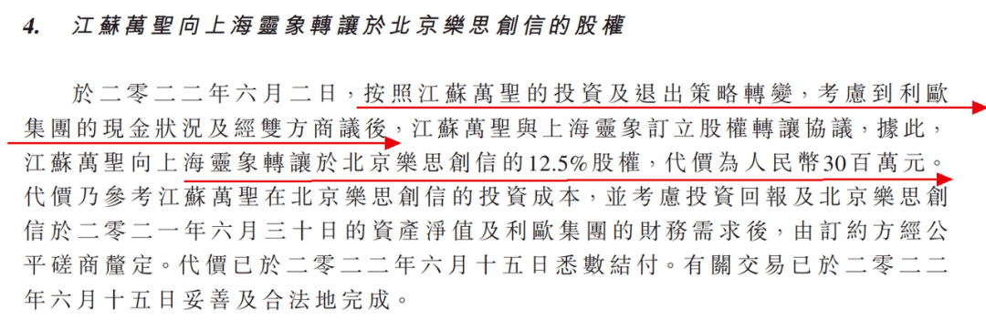 2022年6月,江苏万圣转让北京乐思创信12.5%股权,套现3000万元。乐思集团表示,按照江苏万圣的投资及退出策略转变,考虑到利欧股份的现金状况,这是双方商议后决定的结果。
