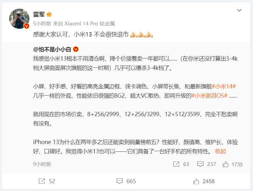 有网友提出建议,小米13根本不用清仓,降价卖一年都可以,刚好可以弥补3K-4K之间的小屏市场。的确,小米13的优点放在目前仍然很多,先不说极为罕见的小屏设计,骁龙8 Gen2的性能、IMX800徕卡主摄、50W无线充电、IP68防尘防水、四边近乎等宽的屏幕,在3K-4K价位段打主流大屏手机完全没有问题,而对于网友的建议,雷军表示:小米13不会很快退市。