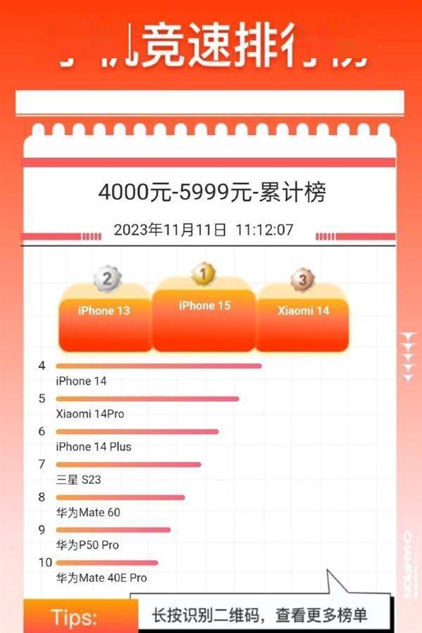 手机品类中的数据很有意思,根据京东手机竞速排行榜显示,截至今天上午11点左右,4000元-5999元的高端机中的前三分别是:iPhone 15、iPhone 13、小米14。