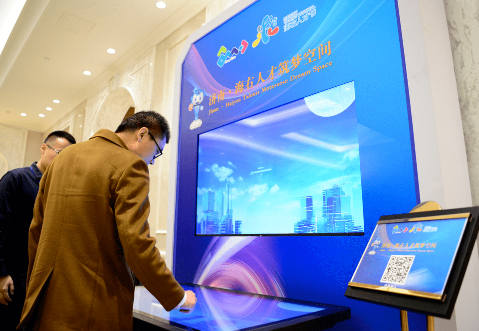 此外,在项目对接会现场,还搭建了“济南·海右人才筑梦空间”。该空间是基于壹点天元先进的元宇宙技术,打造的全方位、多层次的元宇宙生态空间。参赛选手可沉浸式漫步其中,了解济南市重点园区和平台载体的基本情况、重点产业、扶持政策、重点企业、周边配套以及联系方式等。空间内还分区域集中展示第六届大赛参赛项目,方便区县了解项目,实现区县与人才的双向选择,提升对接效率。