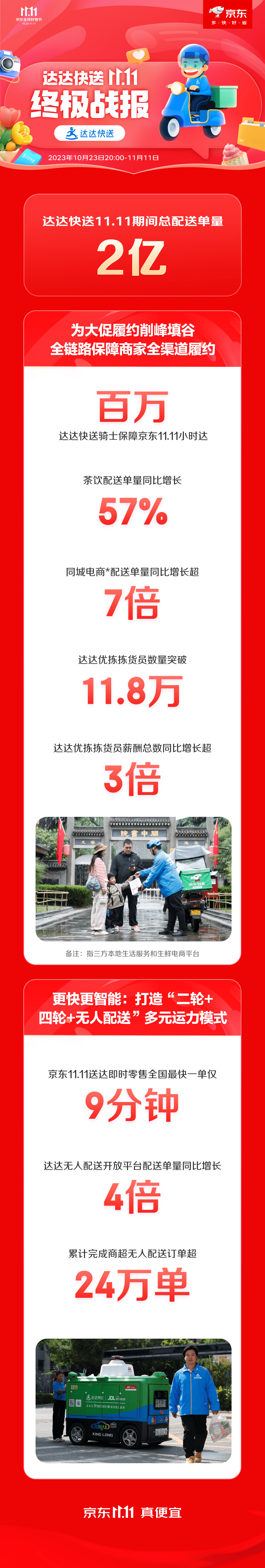 今年京东11.11期间,达达快送配送总单量达2亿,再创新高!京东11.11即时零售全国最快一单送达仅9分钟。百万达达快送骑士穿梭在全国2600多个县区市的街巷,为广大消费者提供最快分钟达、送货送上门的优质服务体验,保障京东11.11小时达。