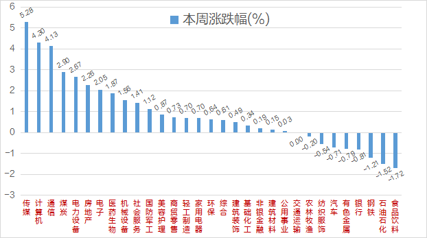 全周维度来看,申万31个一级行业涨多跌少,传媒行业连续两周领跑,本周涨幅依旧超过5%,计算机、通信行业涨超4%,煤炭、电力设备、房地产、电子等涨超2%;食品饮料板块领跌,跌幅达1.72%,石油石化、钢铁跌幅同样超过1%,银行、有色金属、汽车、纺织服装、农林牧渔等均小幅下跌。