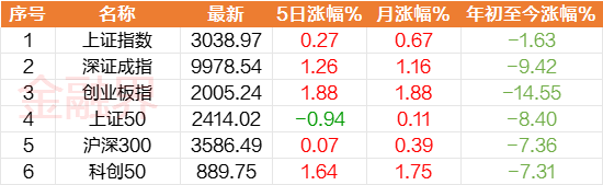 周一A股放量反弹,创业板指大涨逾3%,本周的5个交易日A股整体呈现冲高回落态势,创业板指继续领跑。全周维度看,沪指累计上涨0.27%,深成指涨1.26%,创业板指涨1.88%,上证50指数涨跌0.94%,沪深300指数涨0.07%,科创50指数涨1.64%;三大指数周线均现3连涨走势,其中深成指、创业板指3连阳。