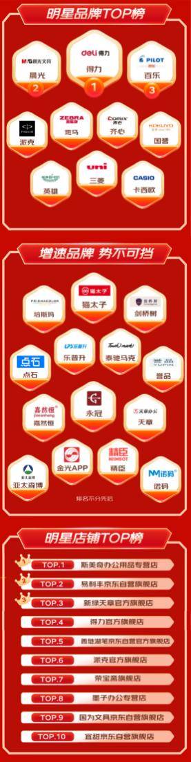 优质的品牌、店铺更容易受到消费者认可。京东11.11全周期,得力、晨光、百力等品牌登上明星品牌TOP榜;培斯玛、猫太子、剑桥树则名列品牌增速榜前三位;斯美奇办公用品专营店、易利丰京东自营旗舰店、新绿天章官方旗舰店则斩获11.11全时期明星店铺TOP榜前三甲。