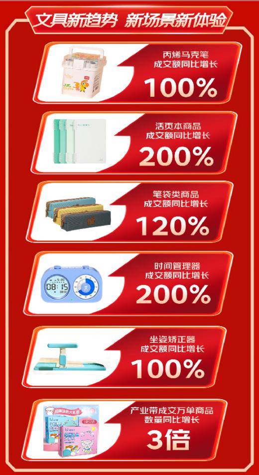 时代的发展让文具需求愈加多元化,京东11.11持续围绕消费者需求并携手品牌上线众多趋势新品,在学习习惯养成、日常文具需求等场景下让更多趋势新品成为爆品。京东11.11全周期,丙烯马克笔成交额同比增长超100%;活页本商品成交额同比增长超200%;笔袋类商品成交额同比增长超120%;时间管理器成交额同比增长200%;坐姿矫正器成交额同比增长100%。同时,京东11.11全周期,产业带益智文具全周期成交额同比增长6倍、产业带全周期成交万单商品数量同比增长3倍。由此可见,功能更加完善、形式更加多样化的文具正在赢得更多家长群体的关注。
